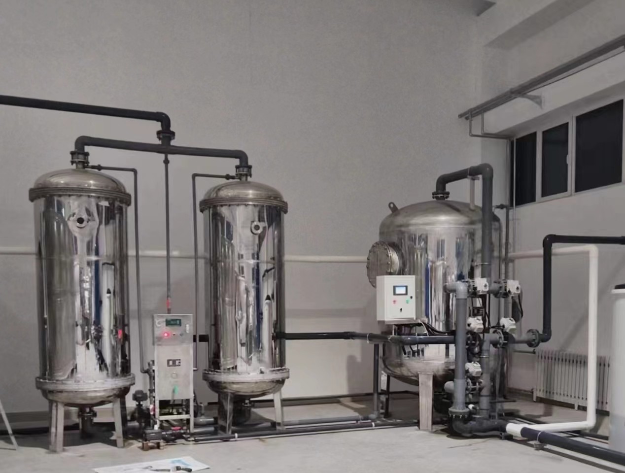 When the operating tank reaches the set water production capacity, it automatically goes into regeneration mode, and the backup tank takes over the operation. The entire softening system operates in a fully automatic mode, and the operation of the softening tank includes several process stages: running, backwashing, brine suction, ion exchange, forward flushing, and standby.
